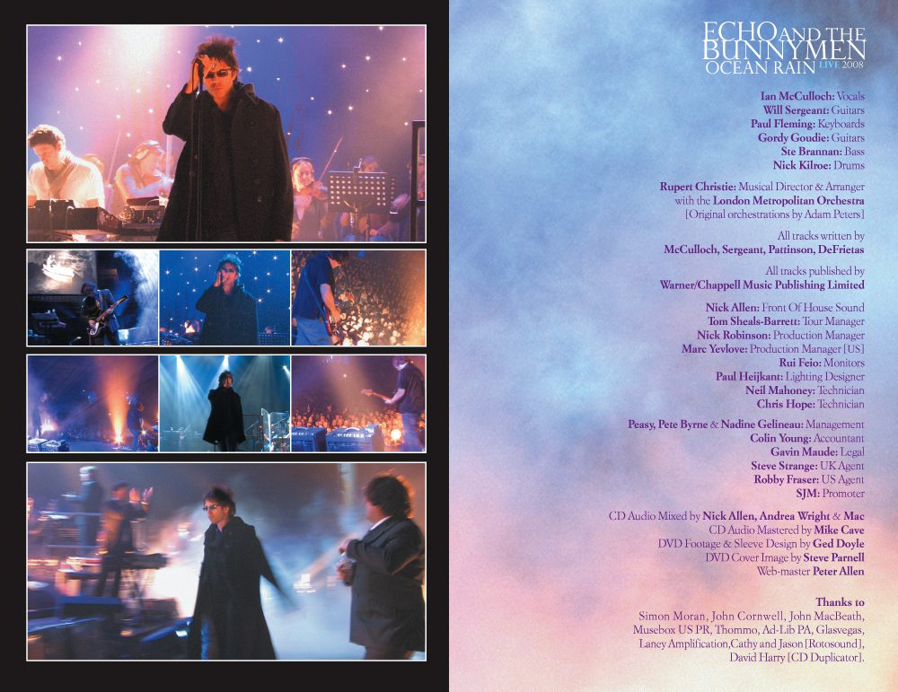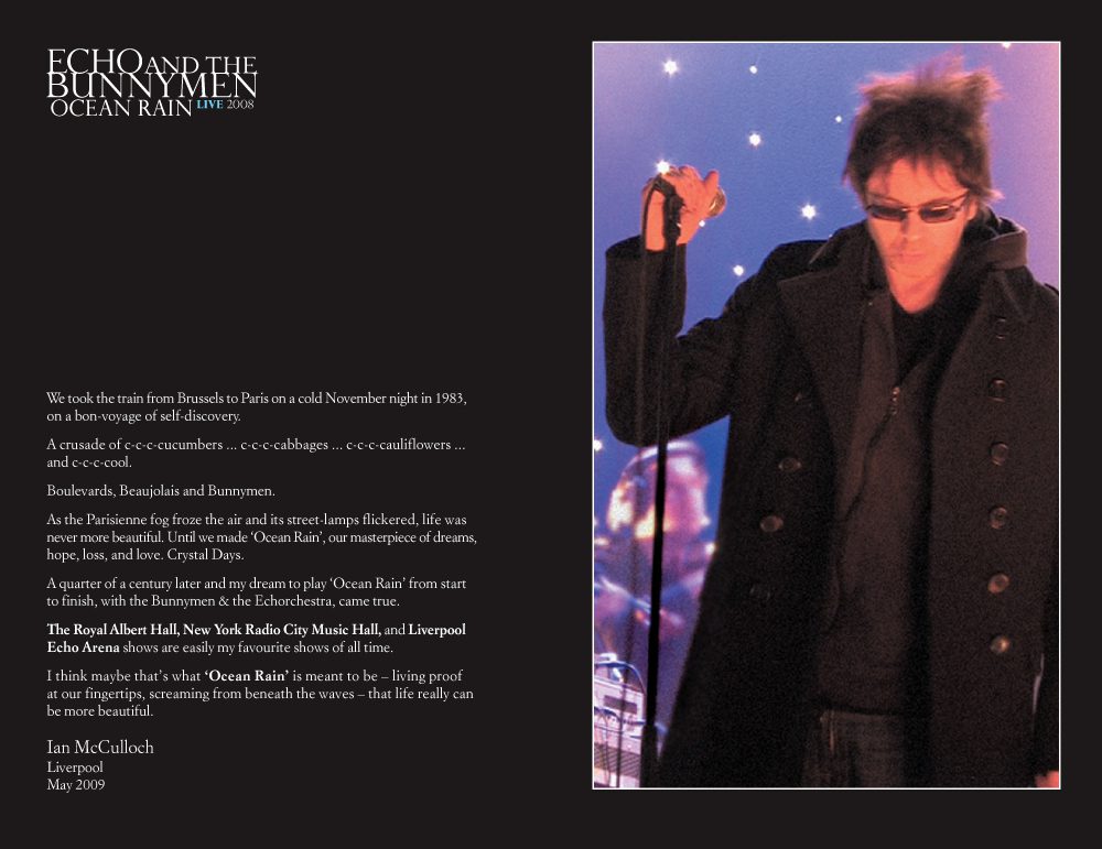 First commissioned by Echo and the Bunnymen in 2002 to design the sleeve for the limited single ‘Make Me Shine’. We then designed their ‘Live in Liverpool’ album sleeve, and then the sleeve for their ‘Siberia’ album for both vinyl and CD. We then had the pleasure of filming and producing the 25th anniversary DVD of their ‘Ocean Rain’ album performances, which took us all on a fantast-c journey from London’s Royal Albert Hall, to New York’s Radio City Music Hall and back to Liverpool’s Echo Arena.